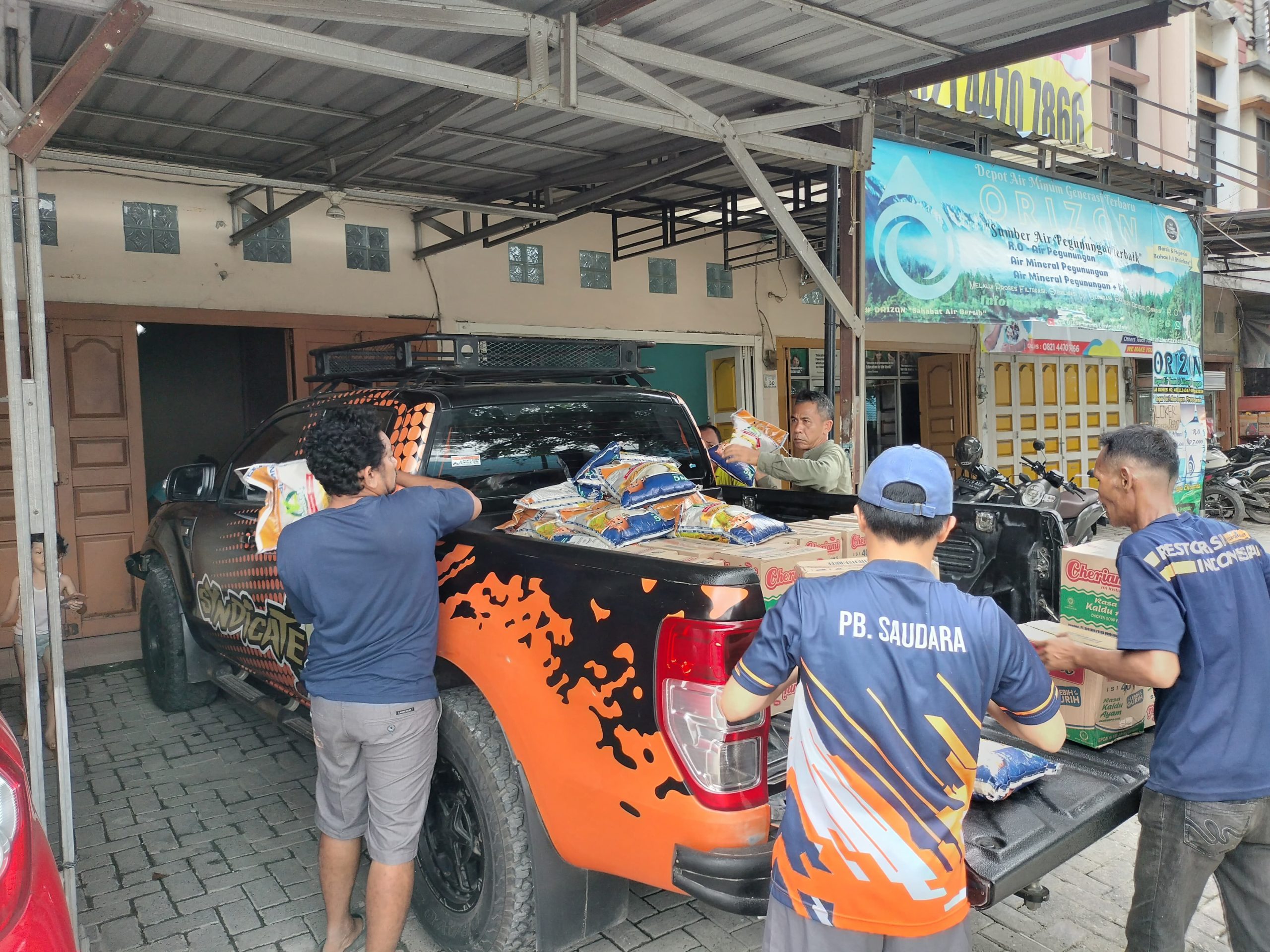 Pemberian bantuan beras dan mie instan murni untuk Anggota Pemuda Pancasila dan masyarakat yang terkena musibah terdampak banjir.