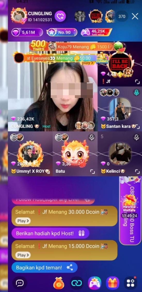 “Poin modusnya live streaming berbentuk gift, di dalam aplikasinya ada permainan jvdi, dan untuk melakukan permainan gamenya, harus top up dan dijadikan koin. Nah, di dalam bentuk aplikasi, dan host live streaming bisa melakukan widdraw dengan modus gaji, dan bermain jvdi,”katanya.